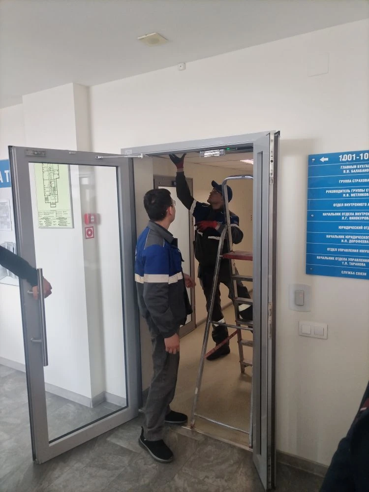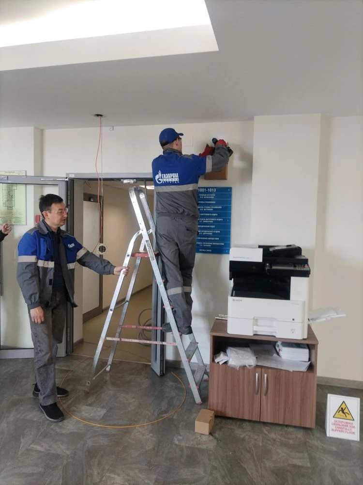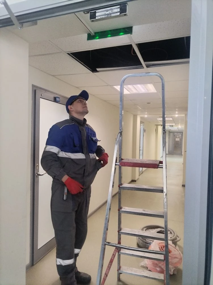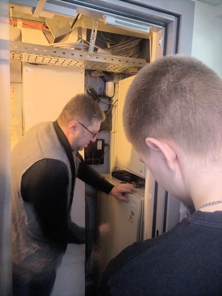Кирилл Валерьевич вместе со своим коллегой осуществляли проводку проводов над навесным потолком с помощью «удочки». Они показали студентам, как правильно прокладывать провод в рабочем помещении с закрытыми стенами ГВМ.